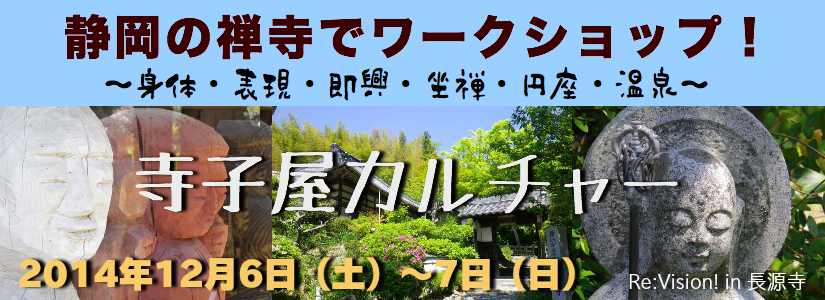 今、お寺で「新しい場作り」が次々に生まれています。前回の岐阜県大禅寺の「山カルチャー」に続き、今回は静岡県長源寺に招かれてのワークショップとなります。今回も体験参加型のワーク(即興表現劇や円座)を通して、楽しくリラックスして遊びながら、まだ見ぬ「自己」と「人」と「場」に出遭いましょう。温泉あり、精進料理あり、座禅体験あり、夜は囲炉裏での語らいあり。静岡県の自然豊かな山寺で、暫しのリトリートはいかがですか?お待ちしています。