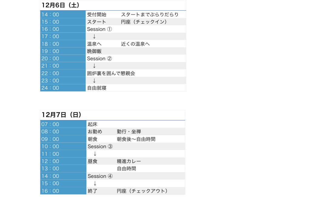 男性は本堂。女性は2階の別室。洗面用具・日用品持参。温かい服装。(寝袋持参の方は布団代700円へ変換します)。